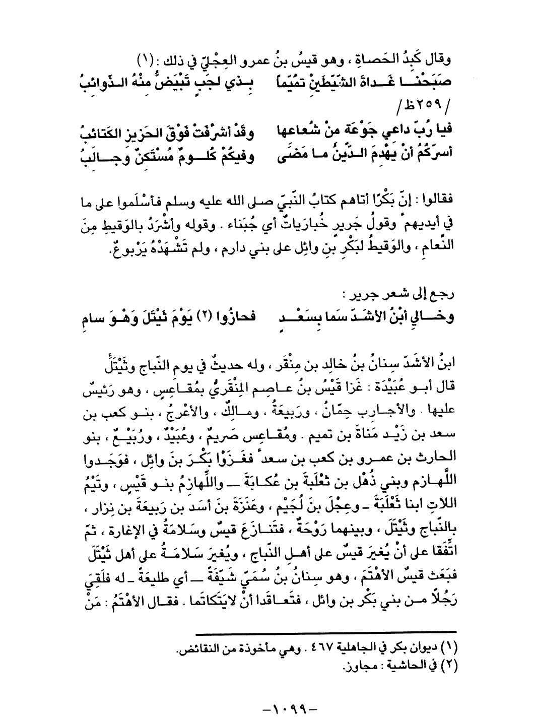 على أهل النباج، ويغير سلامة على أهل ثيتل فبعث قيس الأهتم، وهو سنان بن سمي شيّفة - أي
