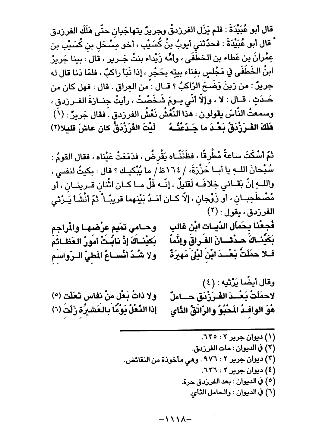 قال أبو عبيدة: فلم يزل الفرزدق وجرير يتهاجيان حتى هلك الفرزدق قال أبو عبيدة: فحدثني أيوب