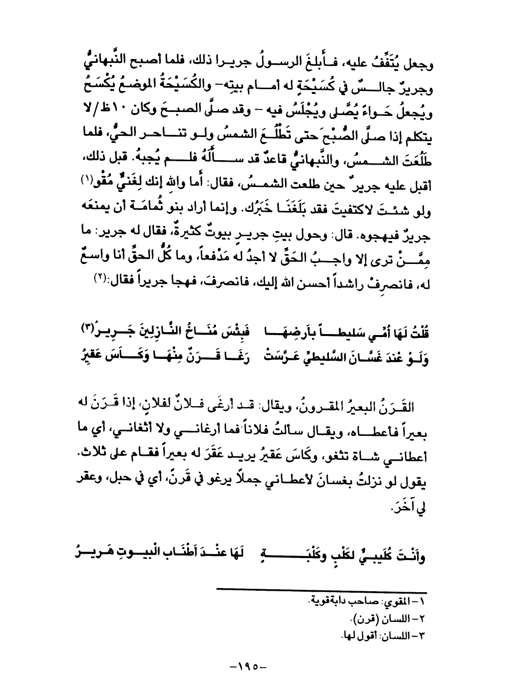 الشمس، والنبهاني قاعدٌ قد سأله فلم يُجبه، قبل ذلك، أقبل عليه جريرٌ حين طلعت الشمس، فقال: أما