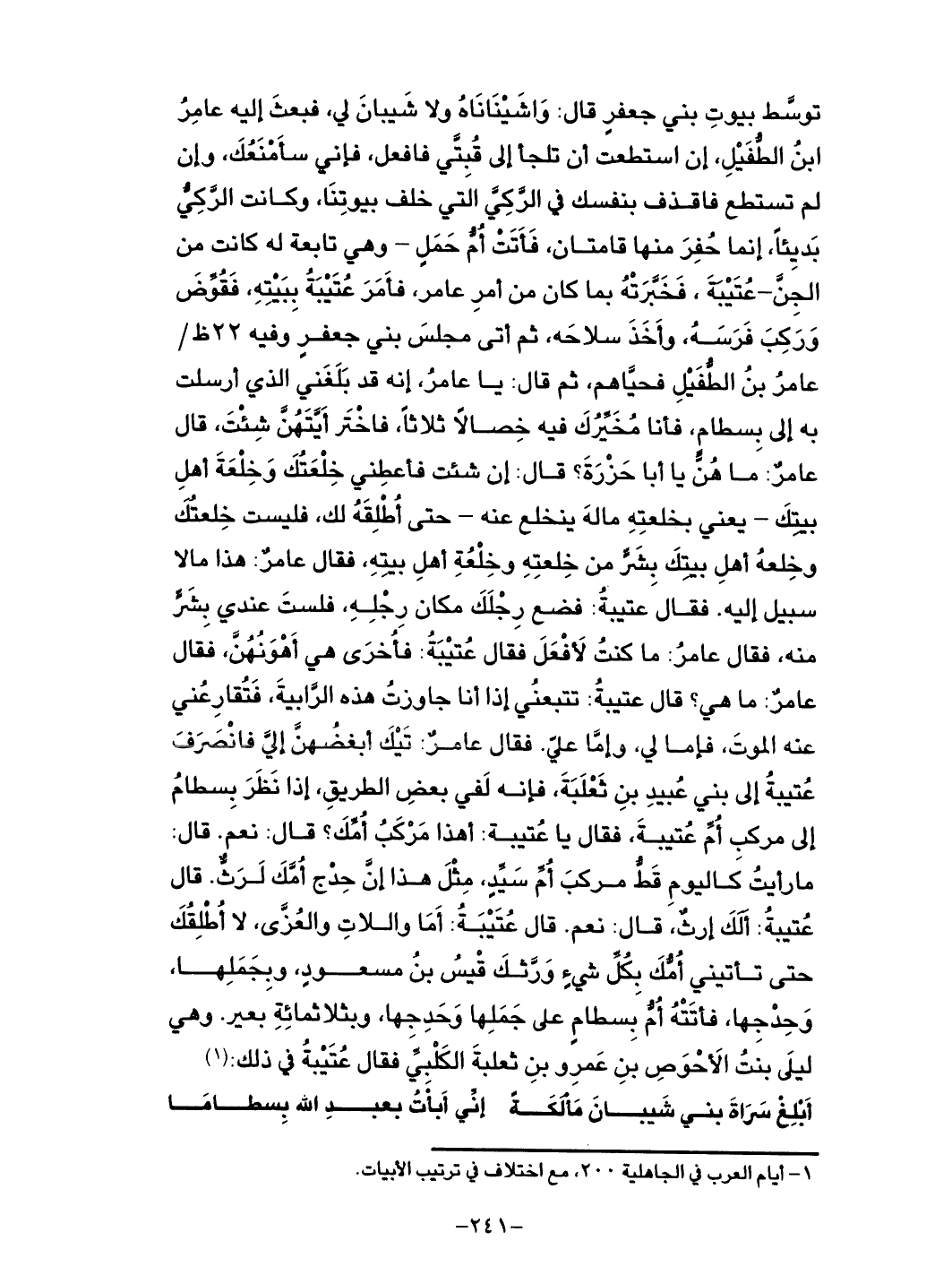 فأمر عتيبة ببيته، فقوّض وركب فرسه، وأخذ سلاحه، ثم أتى مجلس بني جعفر وفيه عامر بن