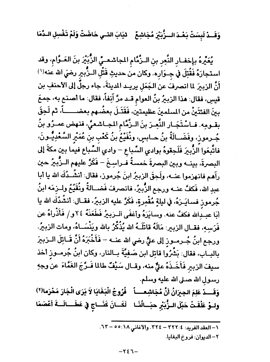 فرسه، فقال الزبير: ما له قاتله الله يُذكّر بالله وينساه، ومات الزبير. ورجع ابن جرموز إلى علي