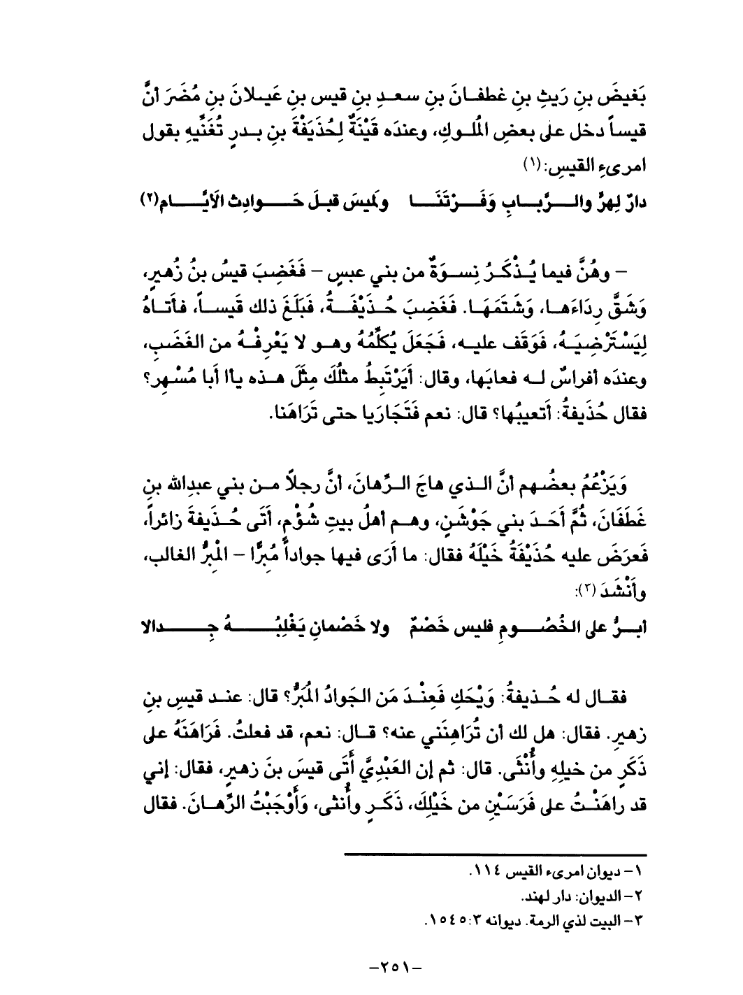 فقال له حذيفة: ويحك فعند من الجواد المبر؟ قال: عند قيس بن زهير. فقال: هل لك أن تراهنني