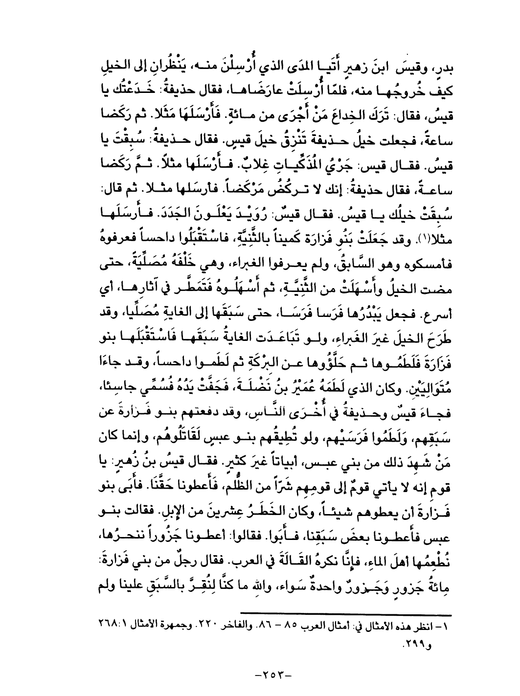 ترك الخداع من أجرى من مائة. فأرسلها مثلا. ثم ركضا ساعة، فجعلت خيل حذيفة تنزق خيل قيس.