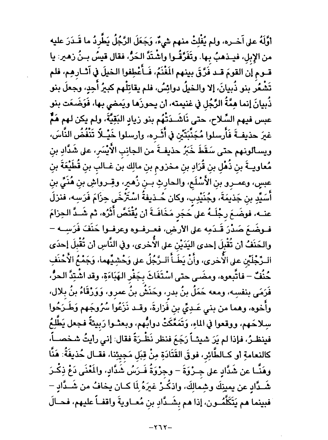 ويسألونهم حتى سقط خبر حذيفة من الجانب الأيسر، على شدّاد بن معاوية بن ذهل بن قراد بن