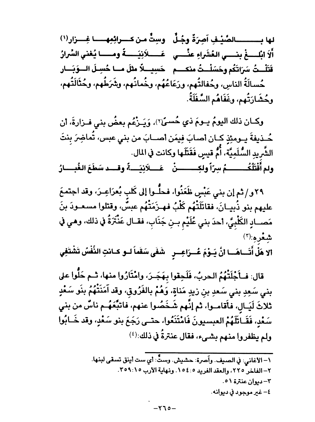 عبس، وقتلوا مسعود بن مصاد الكلبي، أحد بني عُليم بن جناب، فقال عنترة في ذلك، وهي في