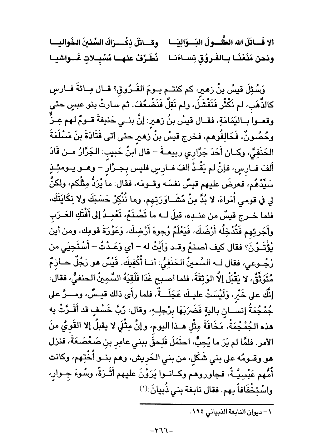 وسُئل قيس بن زهير، كم كنتم يوم الفروق؟ قال مائة فارس كالذهب، لم نكثر فنفشل، ولم نقل