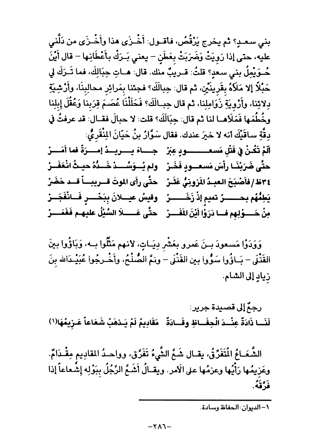 عليه، حتى إذا رويت وضربت بعطن - يعني برك بأعطانها - قال أين حويمل بني سعد؟ قلت:
