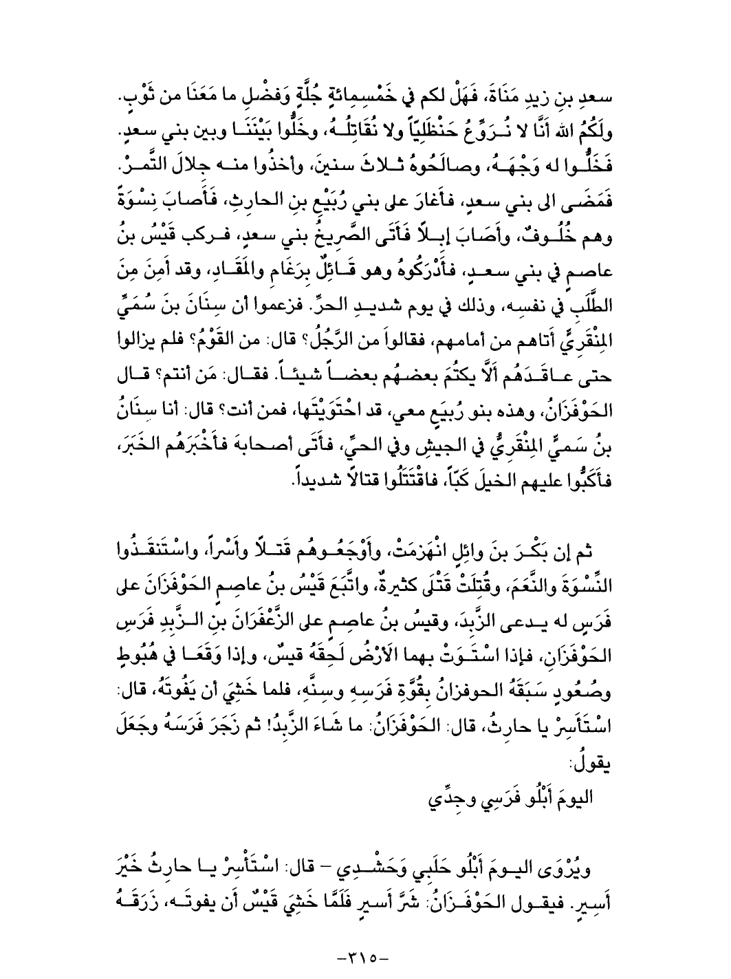 بقوة فرسه وسنه، فلما خشي أن يفوته، قال استأسر يا حارث، قال: الحوفزان: ما شاء الزبد! ثم زجر