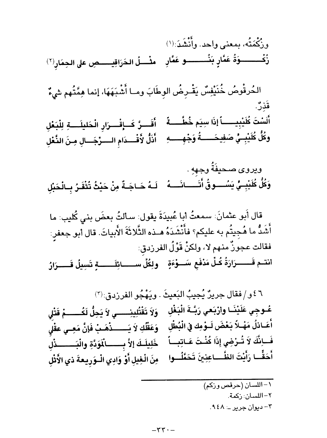 قال أبو عثمان: سمعت أبا عبيدة يقول: سألت بعض بني كليب: ما أشد ما هُجيتم به عليكم؟ فأنشده