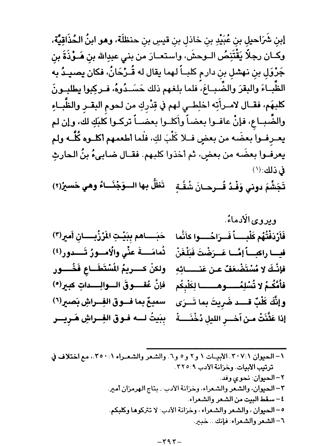 بن جرول بن نهشل بن دارم كلباً لهما يقال له قُرحان، فكان يصيد به الظباء والبقر والضباع، فلما