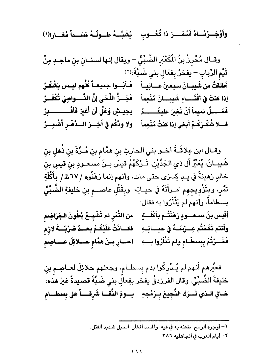 فعيرهم أنهم لم يُدركوا بدم بسطام، وجعلهم حلائل لعاصم بن خليفة الضبي. وقال الفرزدق يفخر