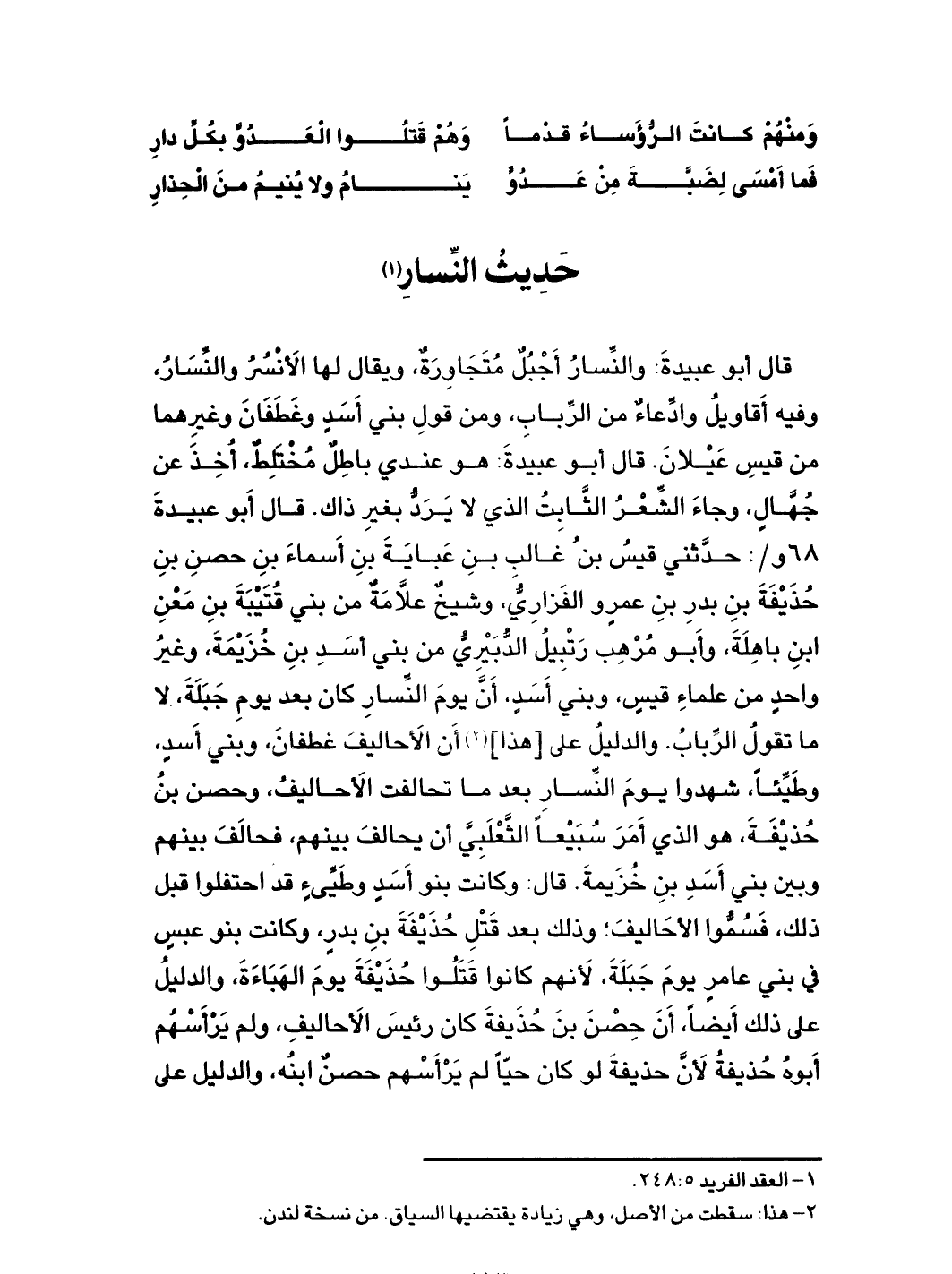 غطفان، وبني أسد، وطيئاً، شهدوا يوم النسار بعدما تحالفت الأحاليف، وحصن بن حذيفة، هو الذي