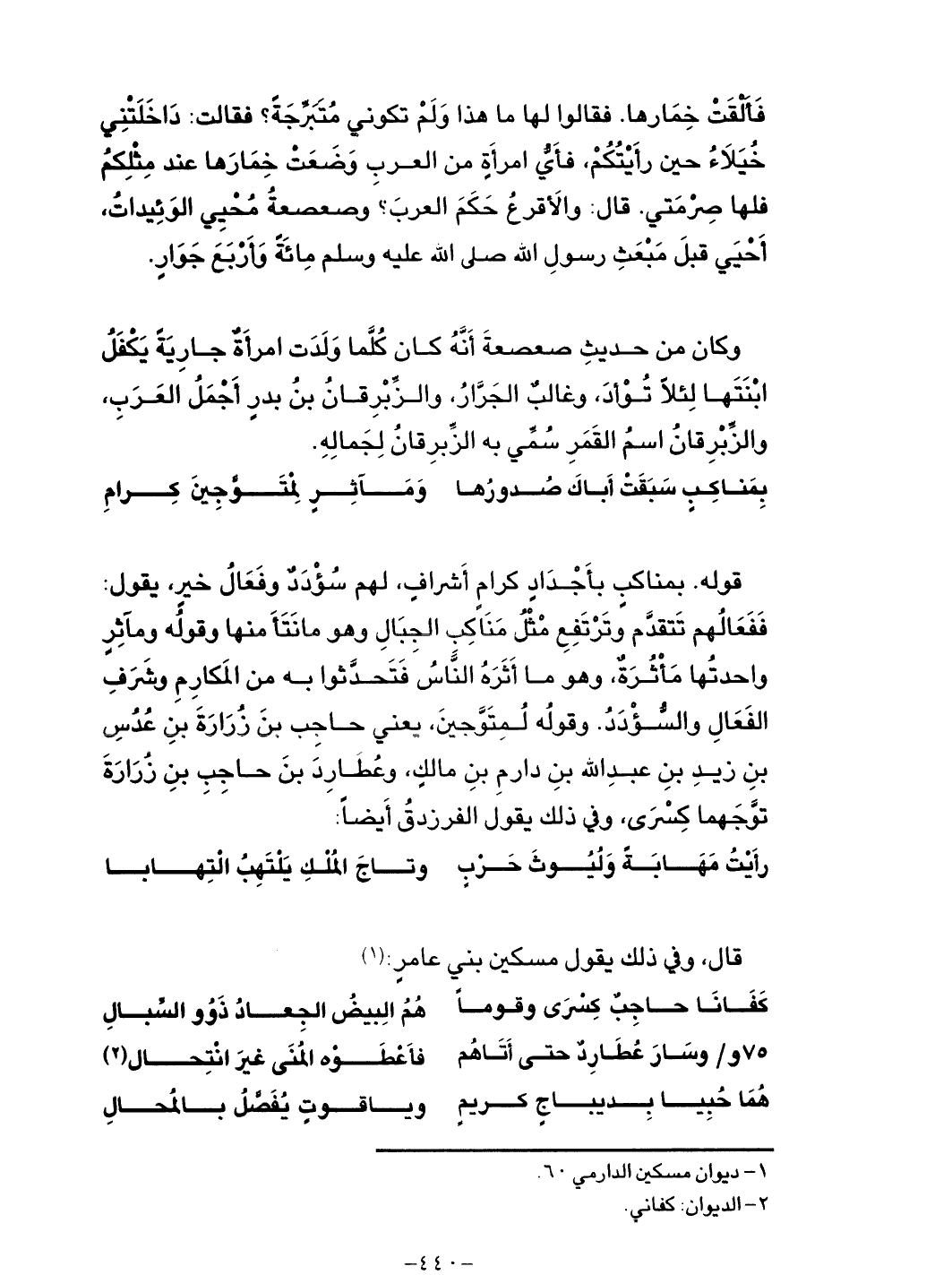 العرب وضعت خمارها عند مثلكم فلها صرمتي. قال: والأقرع حكم العرب؟ وصعصعة محيي