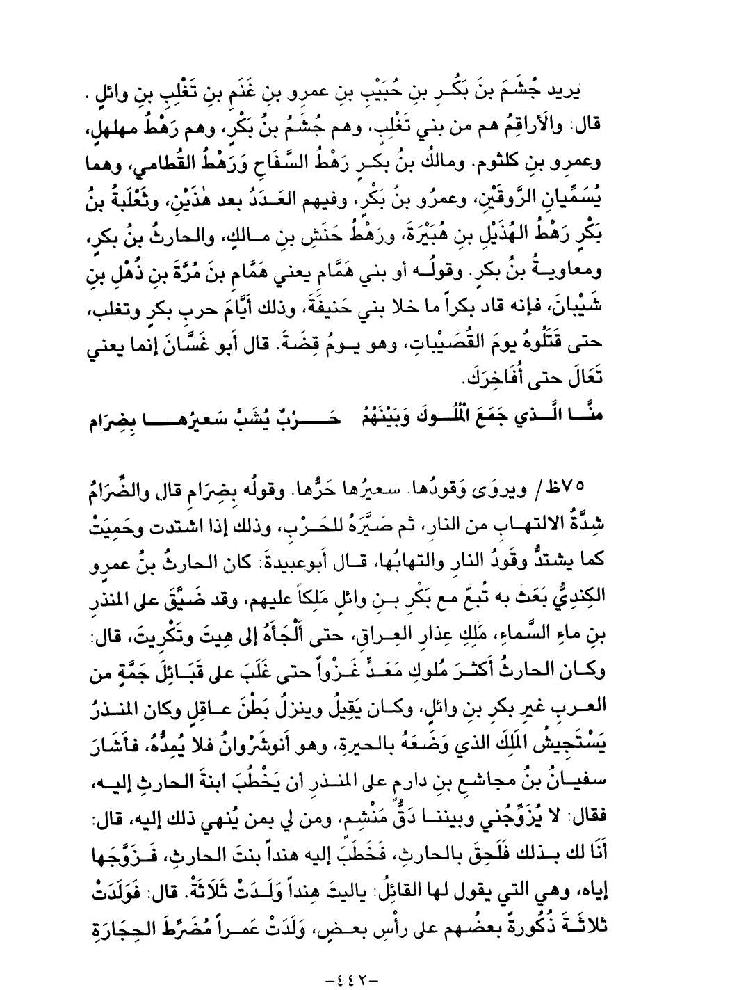 يريد جشم بن بكر بن حبيب بن عمرو بن غنم بن تغلب بن وائل. قال: والأراقم هم من بني تغلب،