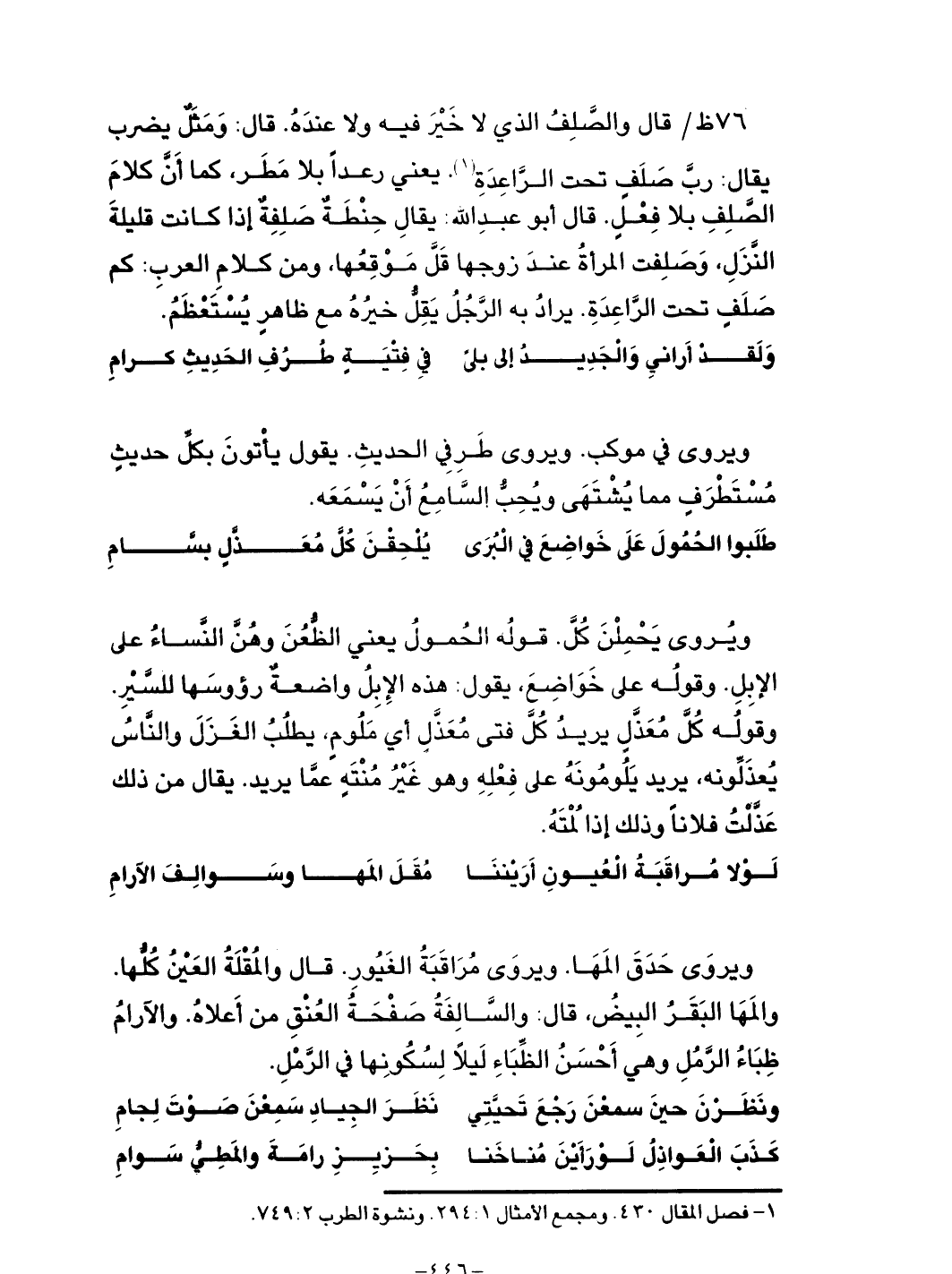 قال والصلف الذي لا خير فيه ولا عنده. قال: ومثل يضرب يقال: رب صلف تحت الراعدة. يعني
