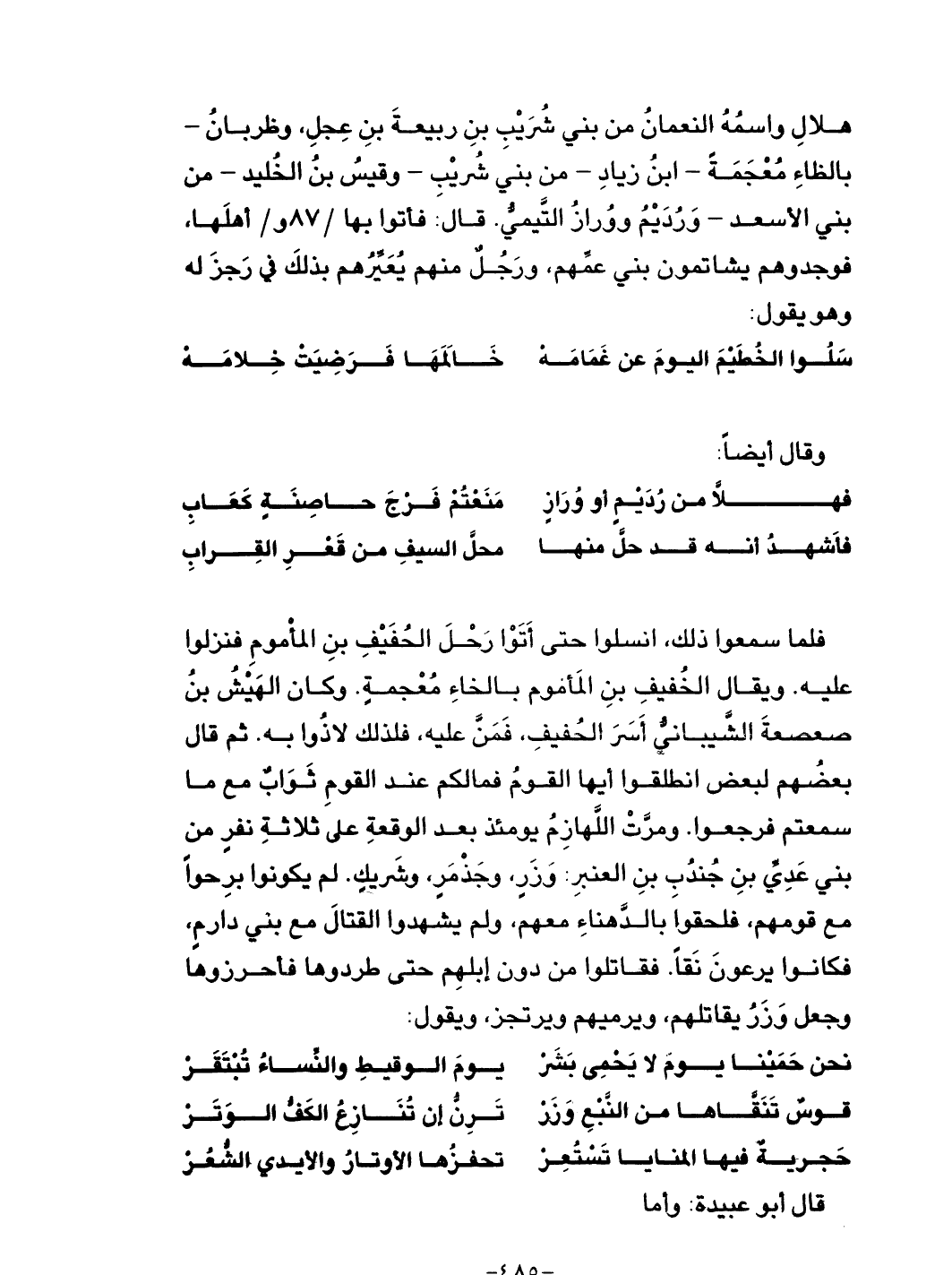 من دون إبلهم حتى طردوها فحرزوها وجعل وزر يقاتلهم، ويرميهم ويرتجز، ويقول: