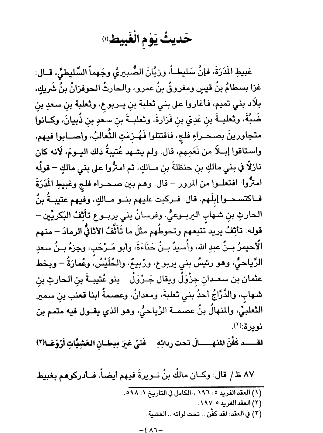 المرور - قال: وهم بين صحراء فلج وغبيط المدرة فاكتسحوا إبلهم. قال: فركبت عليهم بنو مالك،