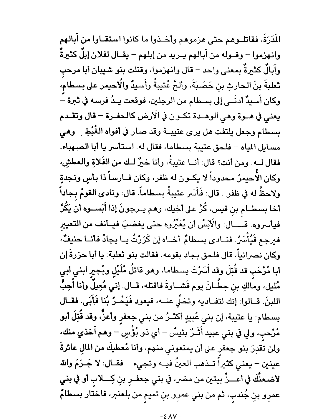 بسطام: يا عتيبة، إن بني عبيد أكثر من بني جعفر وأعز، وقد قُتل أبو مرحب، ولي في بني عبيد