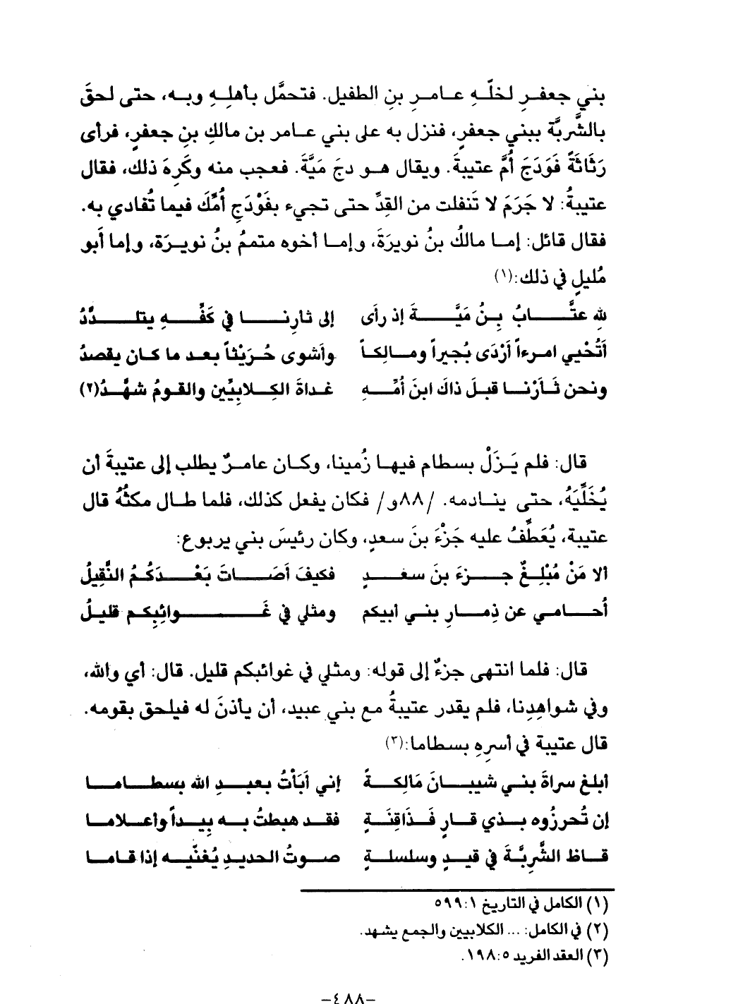 كذلك، فلما طال مكثه قال عتيبة، يعطف عليه جزء بن سعد، وكان رئيس بني يربوع: