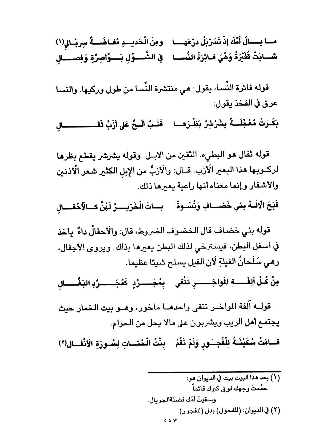 ما بالُ أُمِّكَ إذْ تسربلُ درعَها ... ومِنَ الحديدِ مُفاضَةٌ سِربالي