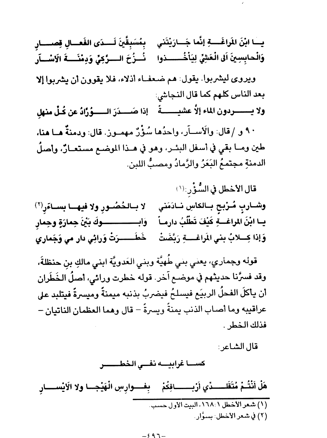 والحابِسِينَ إلى العَشِيِّ ليأخذوا ... نُزُحَ الرَّكِيِّ ودِمْنَةَ الأسآر
