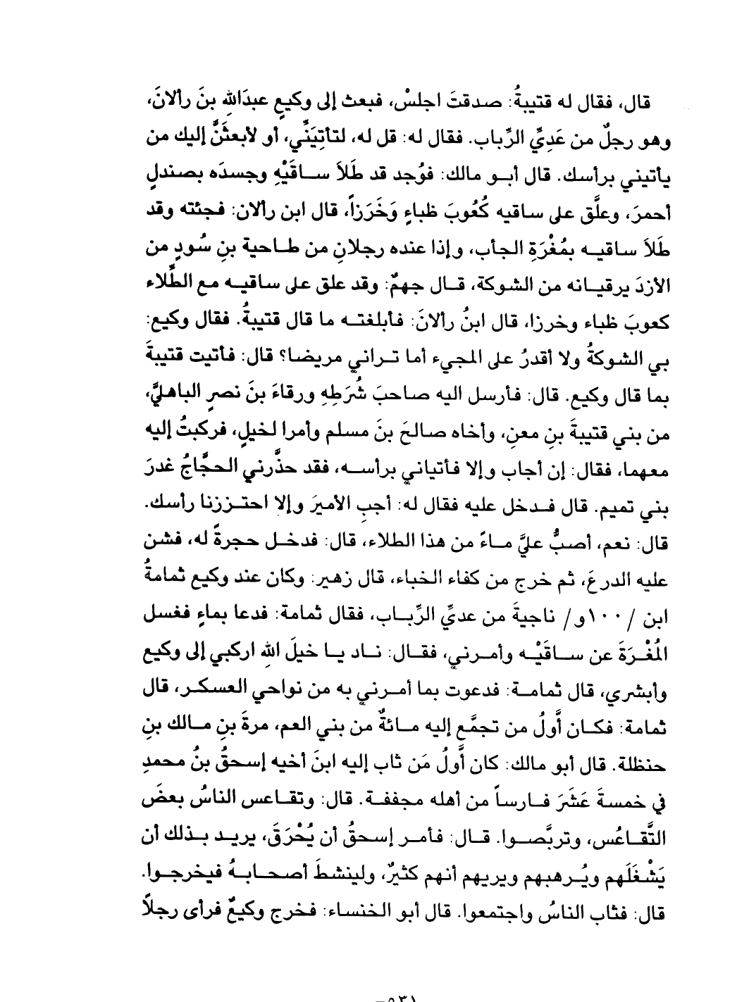 اركبي إلى وكيع وأبشري، قال ثمامة: فدعوت بما أمرني به من نواحي العسكر، قال ثمامة: فكان