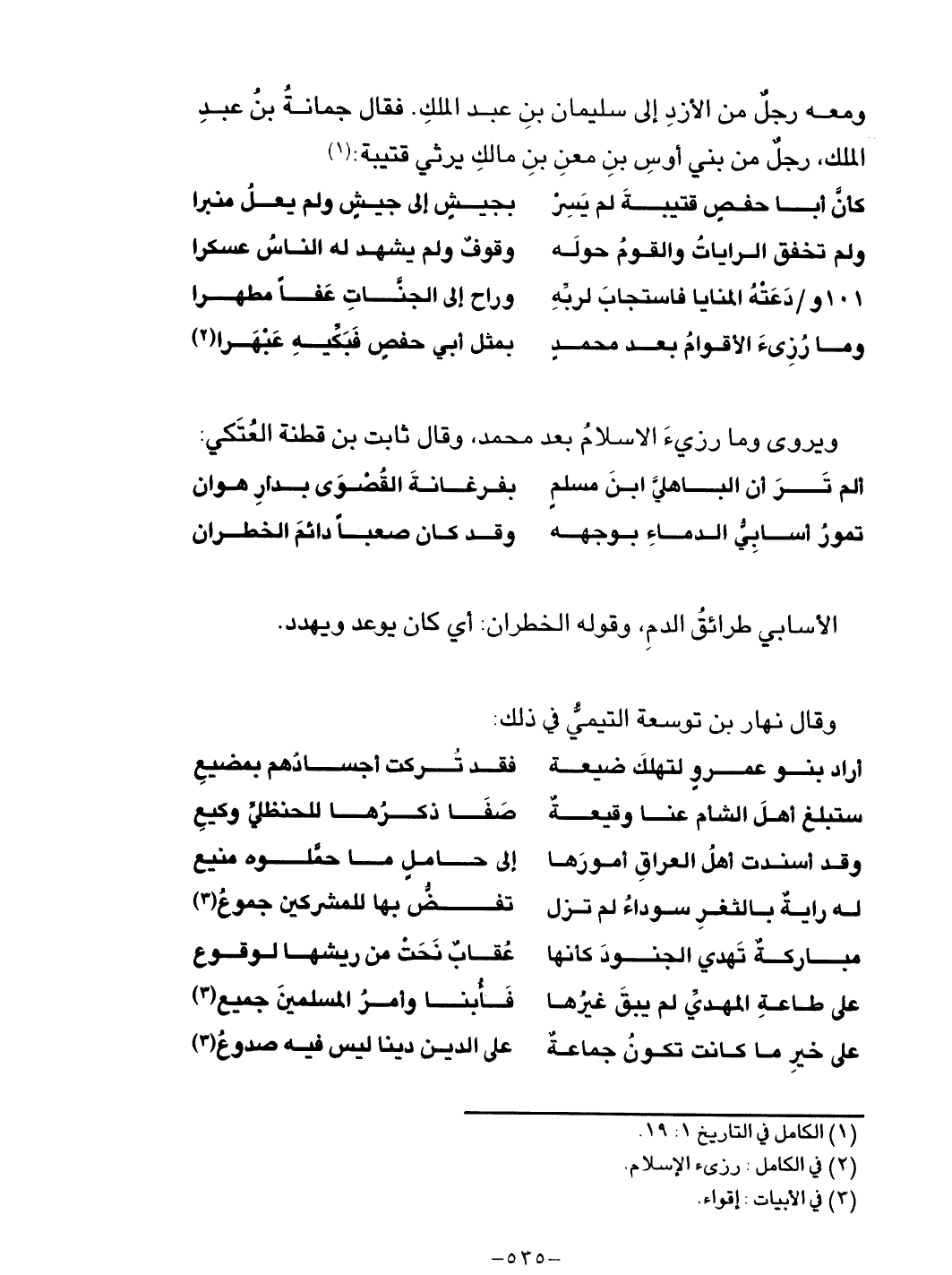 ومعه رجل من الأزد إلى سليمان بن عبد الملك. فقال جمانة بن عبد الملك، رجل من بني أوس بن معن بن مالك