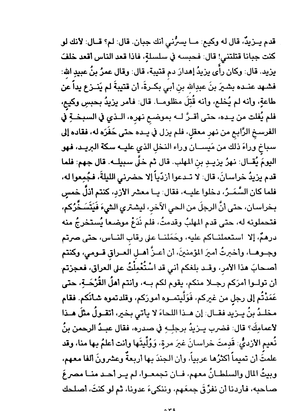 قال ثم خلى سبيله. قال جهم: فلما قدم يزيد خراسان، قال: لا تدعوا أزديا إلا حضرني الليلة،