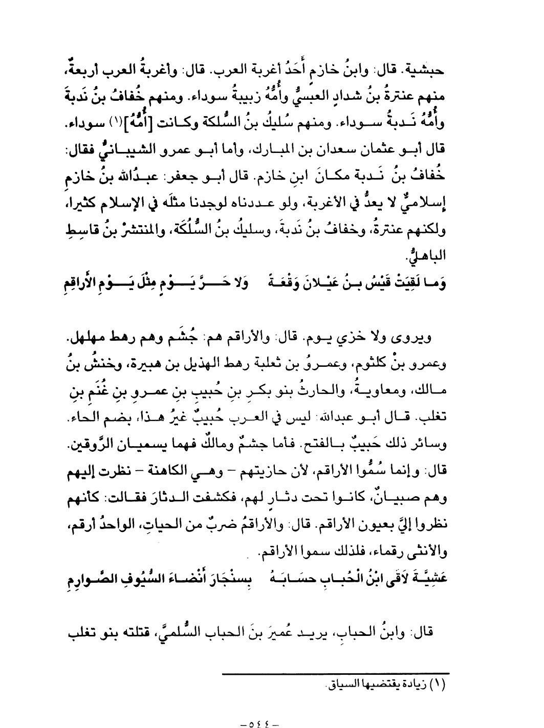 خفاف بن ندبة مكان ابن خازم. قال أبو جعفر: عبد الله بن خازم إسلامي لا يعد في الأغربة، ولو