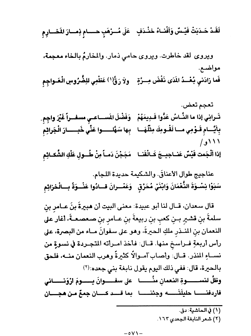 قال سعدان، قال لنا أبو عبيدة: معنى البيت أن هبيرة بن عامر بن سلمة بن قشير بن كعب بن ربيعة