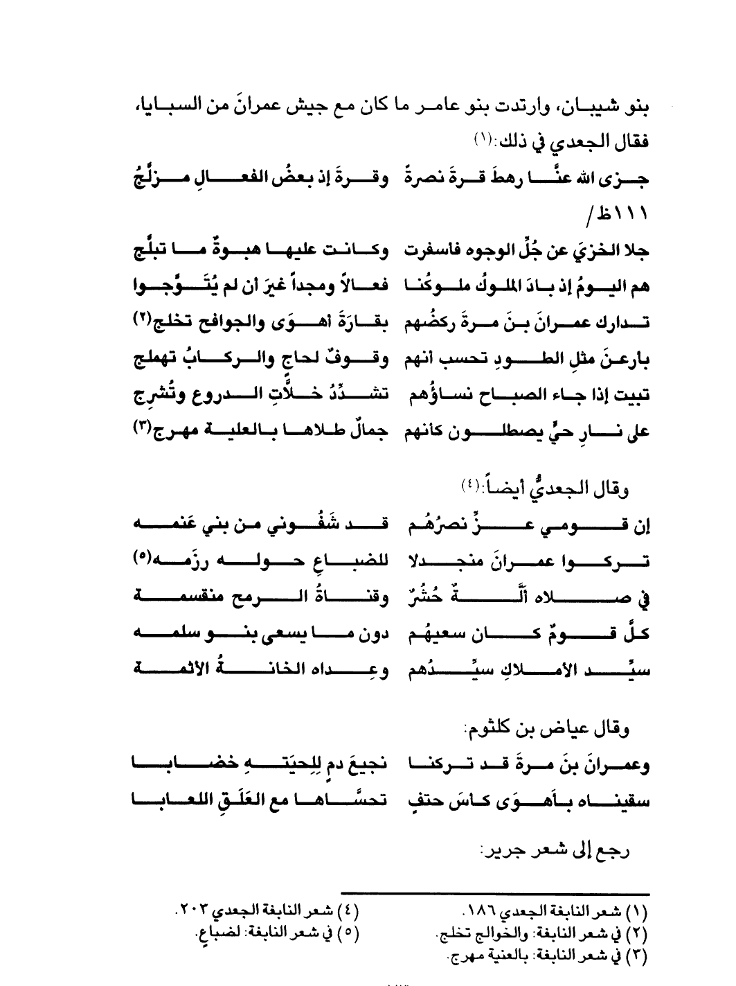 بنو شيبان، وارتدت بنو عامر ما كان مع جيش عمران من السبايا، فقال الجعدي في ذلك: