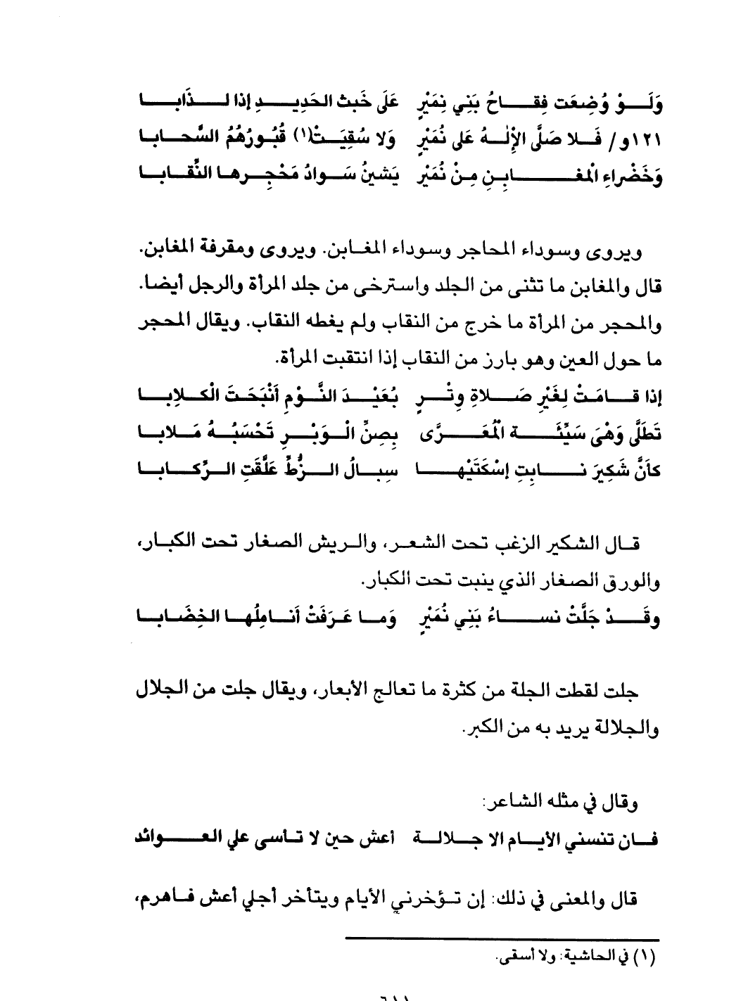 وخضْراءِ المغابِنِ مِنْ نُمير ... يشينُ سوادُ مَحْجِرها النِّقابا