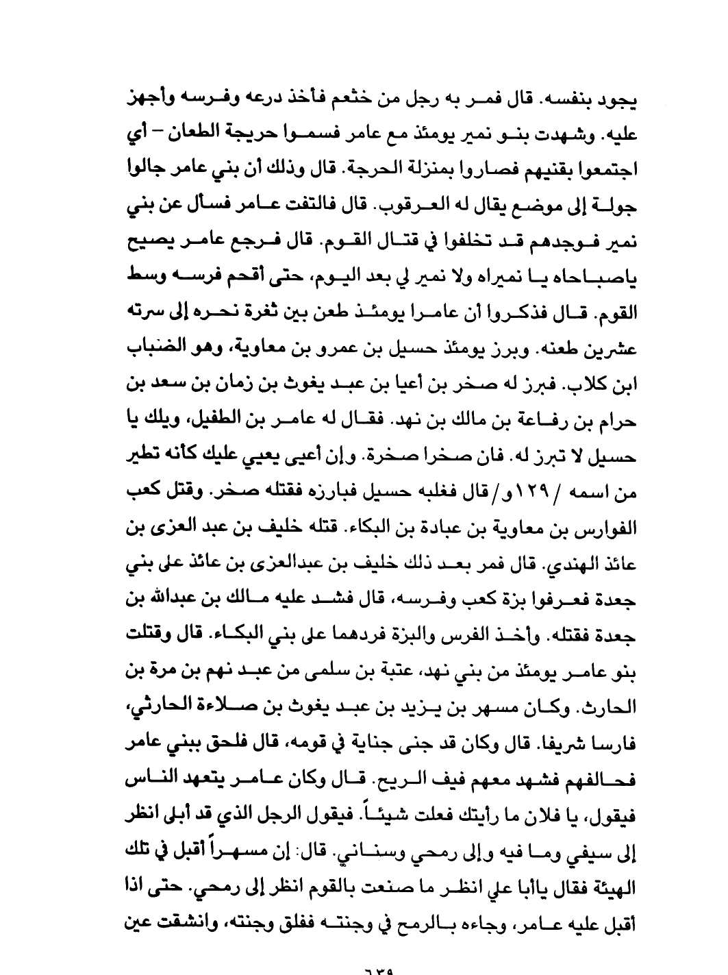 القوم. قال فرجع عامر يصيح يا صباحاه يا نميراه ولا نمير لي بعد اليوم، حتى أقحم فرسه وسط