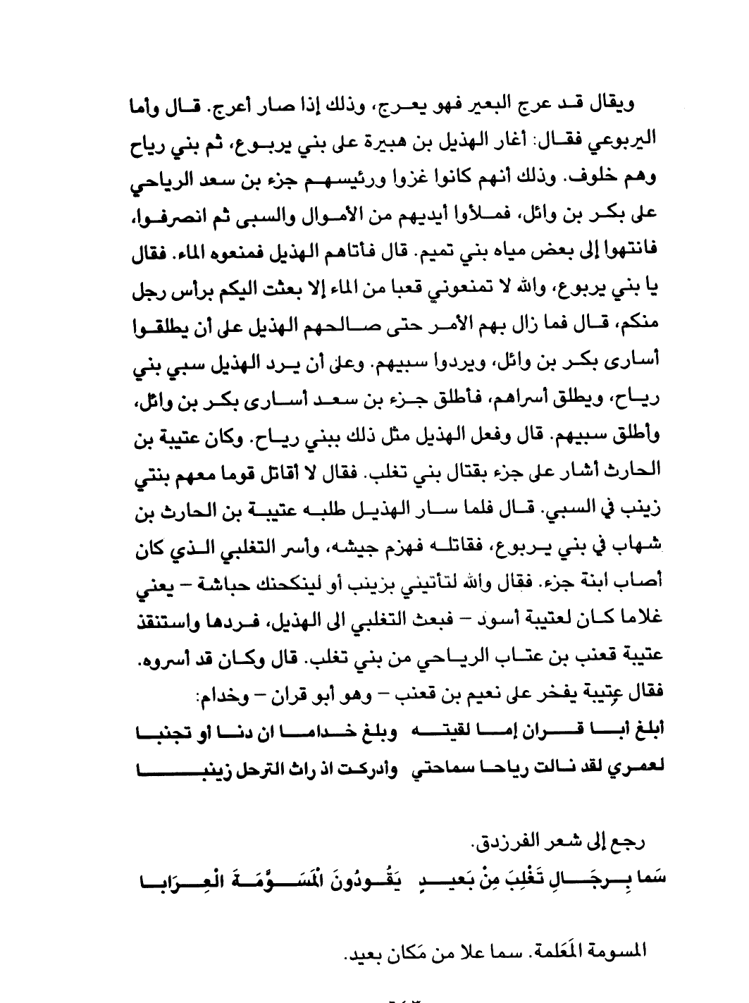 بني تميم. قال فأتاهم الهذيل فمنعوه الماء. فقال يا بني يربوع، والله لا تمنعوني قعبا من الماء إلا