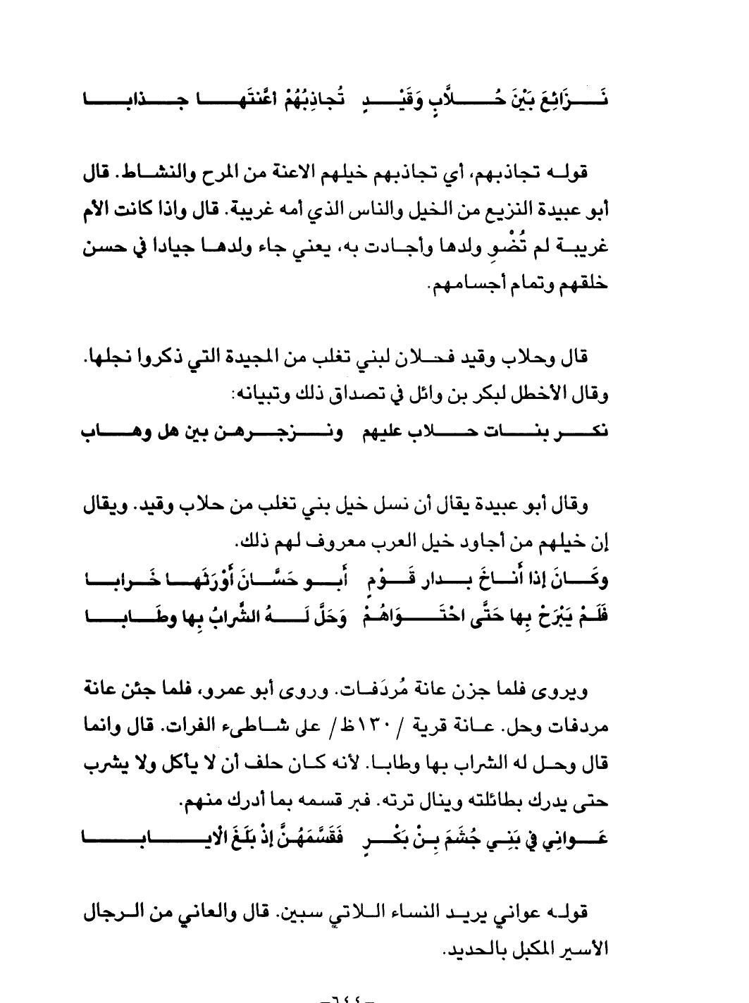 وقال أبو عبيدة يقال أن نسل خيل بني تغلب من حلاب وقيد. ويقال إن خيلهم من أجاود خيل العرب