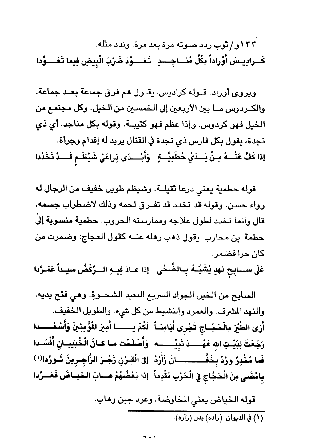 بِأمضَى مِنَ الحجَّاجِ في الحرْب مُقدماً ... إذا بعضُهُمْ هابَ الخياضَ فعرَّدا