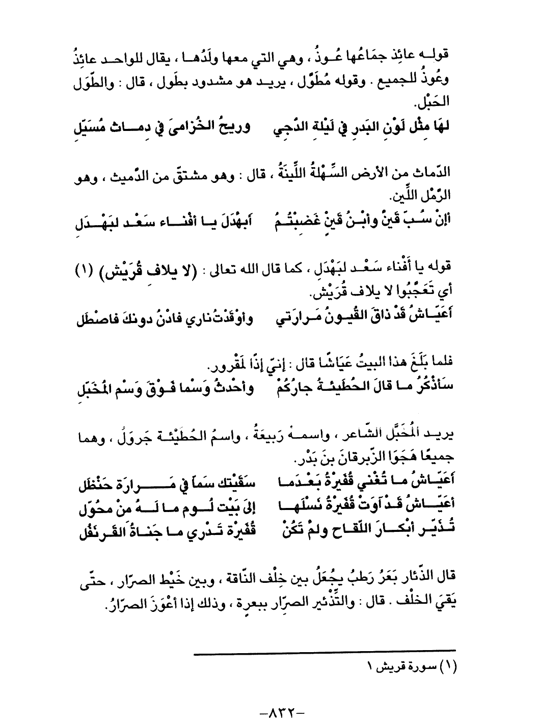 قوله عائذ جماعها عوذ، وهي التي معها ولدها، يقال للواحد عائذ وعوذ للجميع. وقوله مطول، يريد