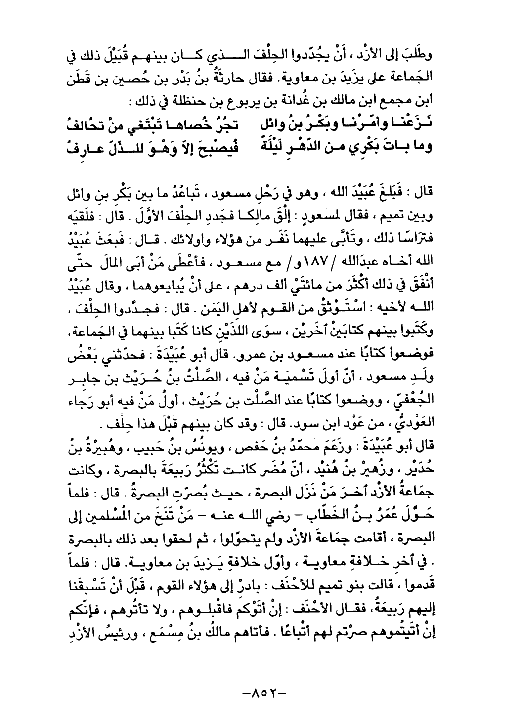 قال: فبلغ عبيد الله، وهو في رحل مسعود، تباعد ما بين بكر بن وائل وبين تميم، فقال لمسعود: إلق