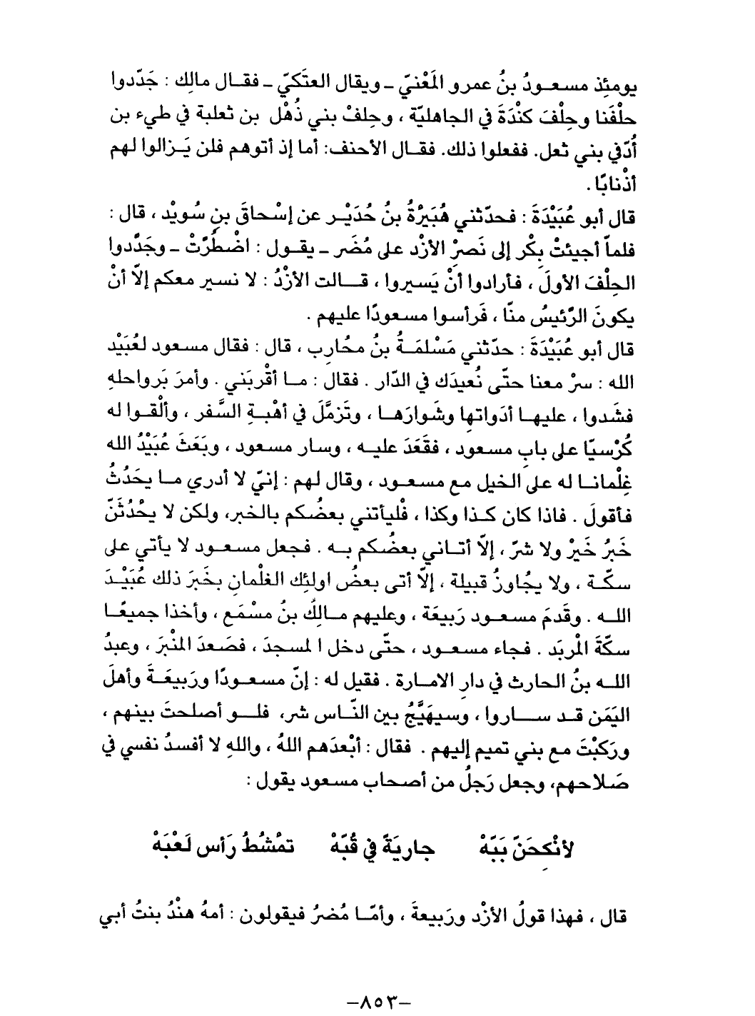 قال أبو عبيدة: فحدثني هبيرة بن حُدير عن إسحاق بن سويد، قال: فلما أجيئت بكر إلى نصر الأزد