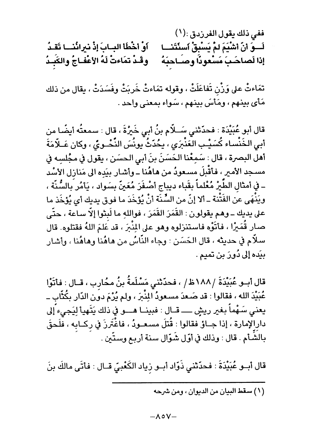 قال أبو عبيدة: فحدثني سلام بن أبي خيرة، قال: سمعته أيضاً من أبي الخنساء كسيب العنبري،