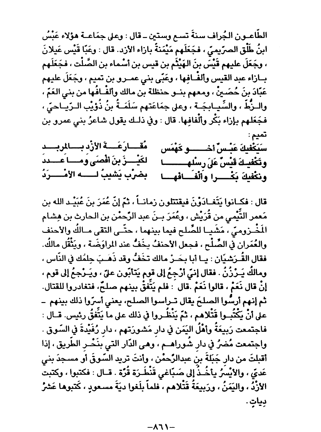 قال: فكانوا يتغادون فيقتتلون زماناً، ثم إنّ عمر بن عبيد الله بن معمر التيمي من قريش، وعمر بن