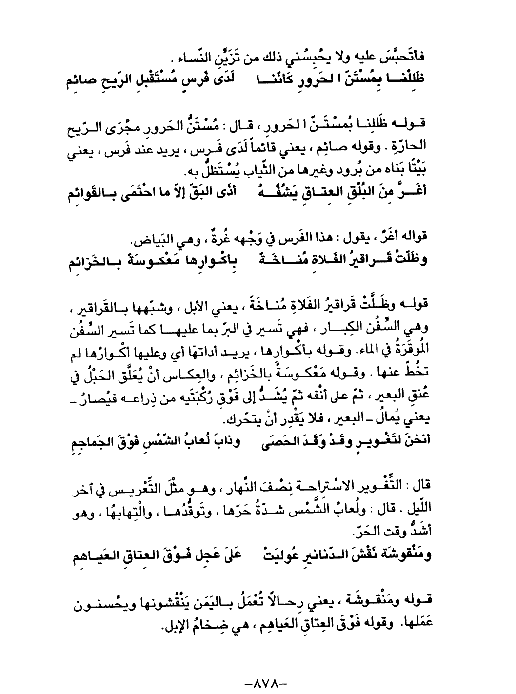 قوله ظَللنا بمُستن الحرور، قال: مُستن الحرور كجرى الريح الحارة. وقوله صائم، يهني قائماً لدى