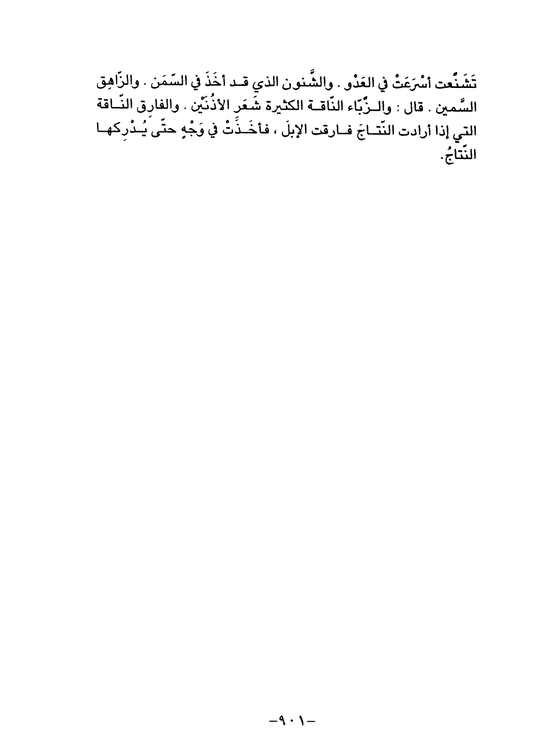 تشنعت أسرعت في العدو. والشنون الذي قد أخذ في السمن. والزاهق السمين. قال: والزباء الناقة