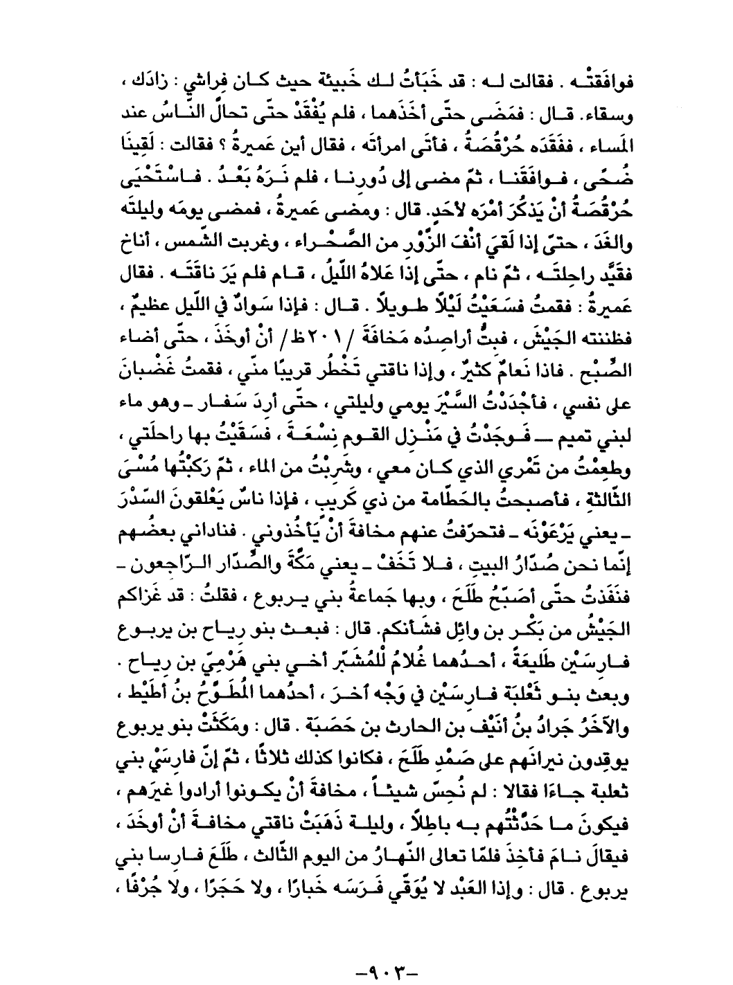 فظننته الجيش، فبت أراصده مخافة أن أوخذ، حتى أضاء الصبح. فإذا نعام كثير، وإذا ناقتي تخطر