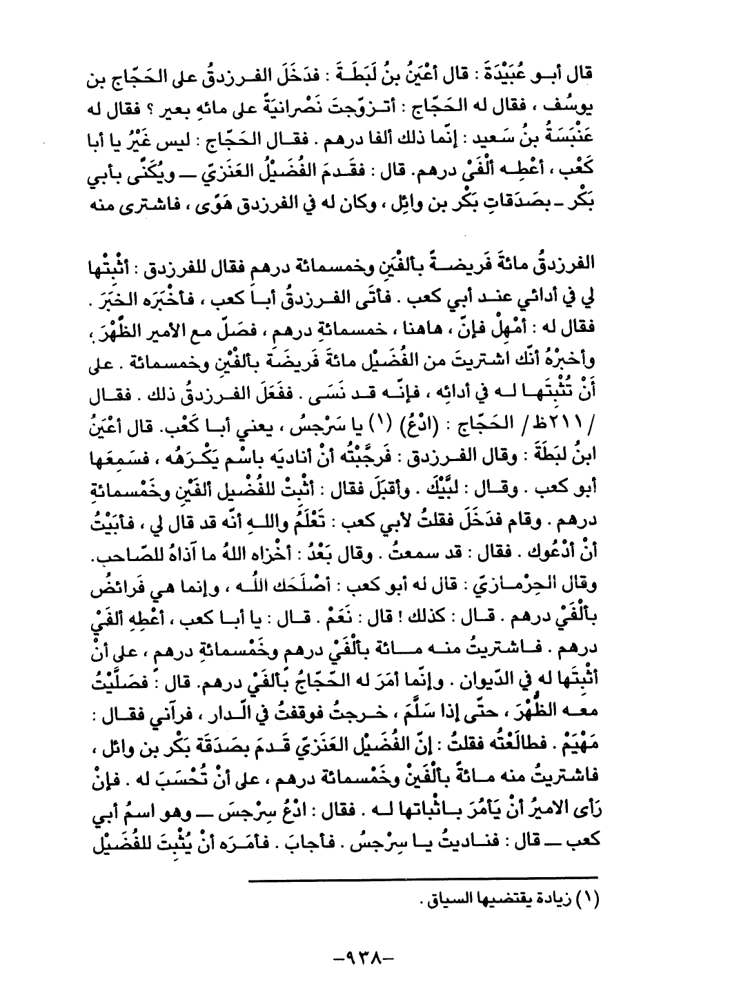 للفرزدق: أثبتها لي في أدائي عند أبي كعب. فأتى الفرزدق أبا كعب، فأخبره الخبر. فقال له: أمهل