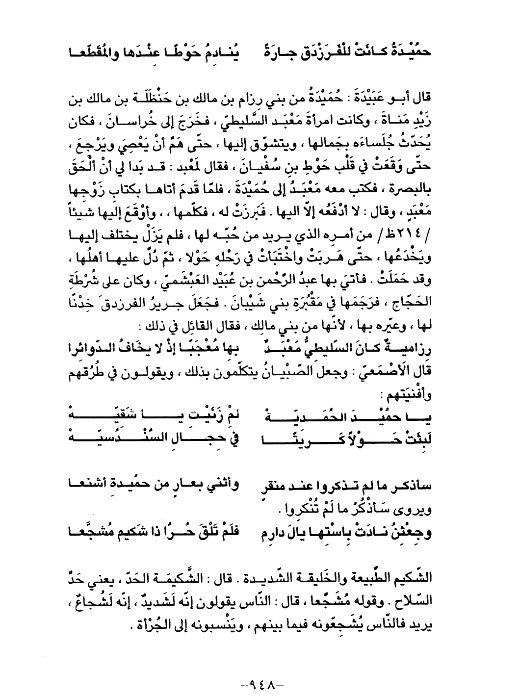 قال أبو عبيدة: حُميدة من بني رزام بن مالك بن حنظلة بن مالك بن زيد مناة، وكانت امرأة معبد