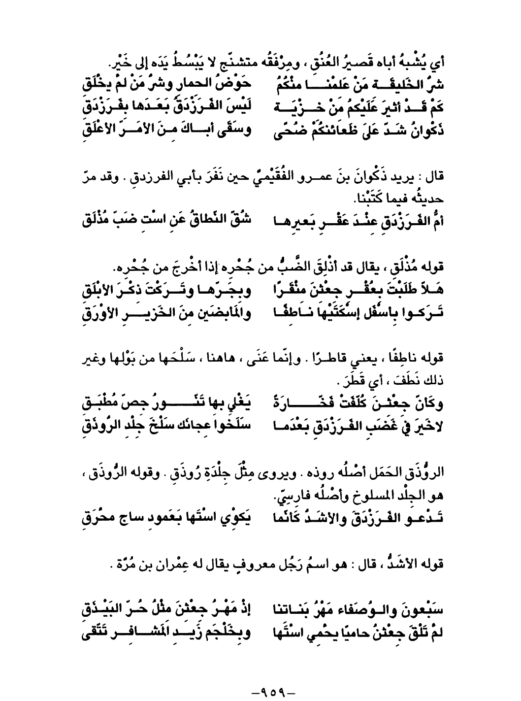 أمُّ الفرزدقِ عندَ عقرِ بعيرِها ... شُقّ النّطاقُ عَنِ أستِ ضَبّ مُذْلَق