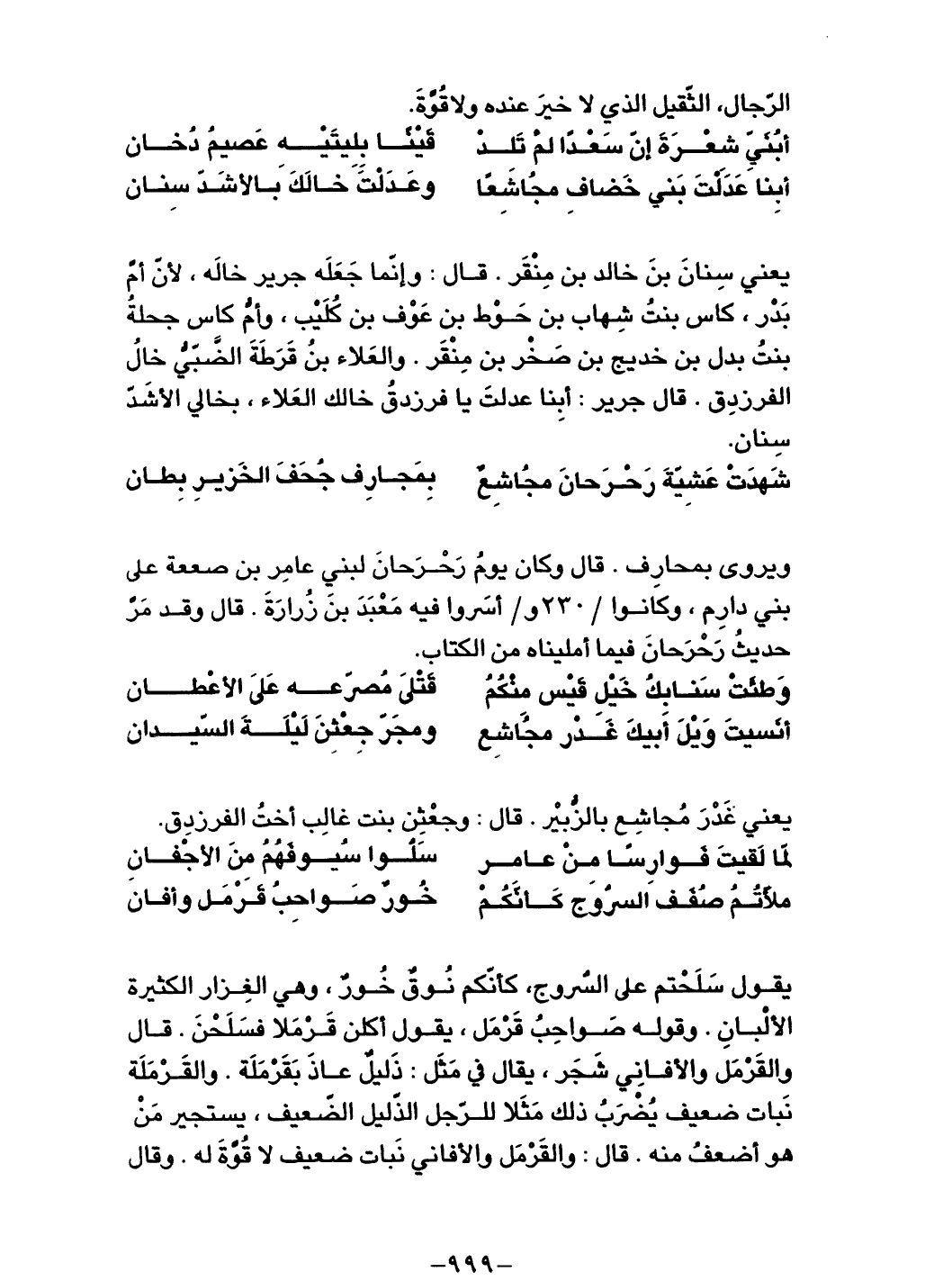 خال الفرزدق. قال جرير: أبنا عدلت يا فرزدق خالك العلاء، بخالي الأشد سِنان.