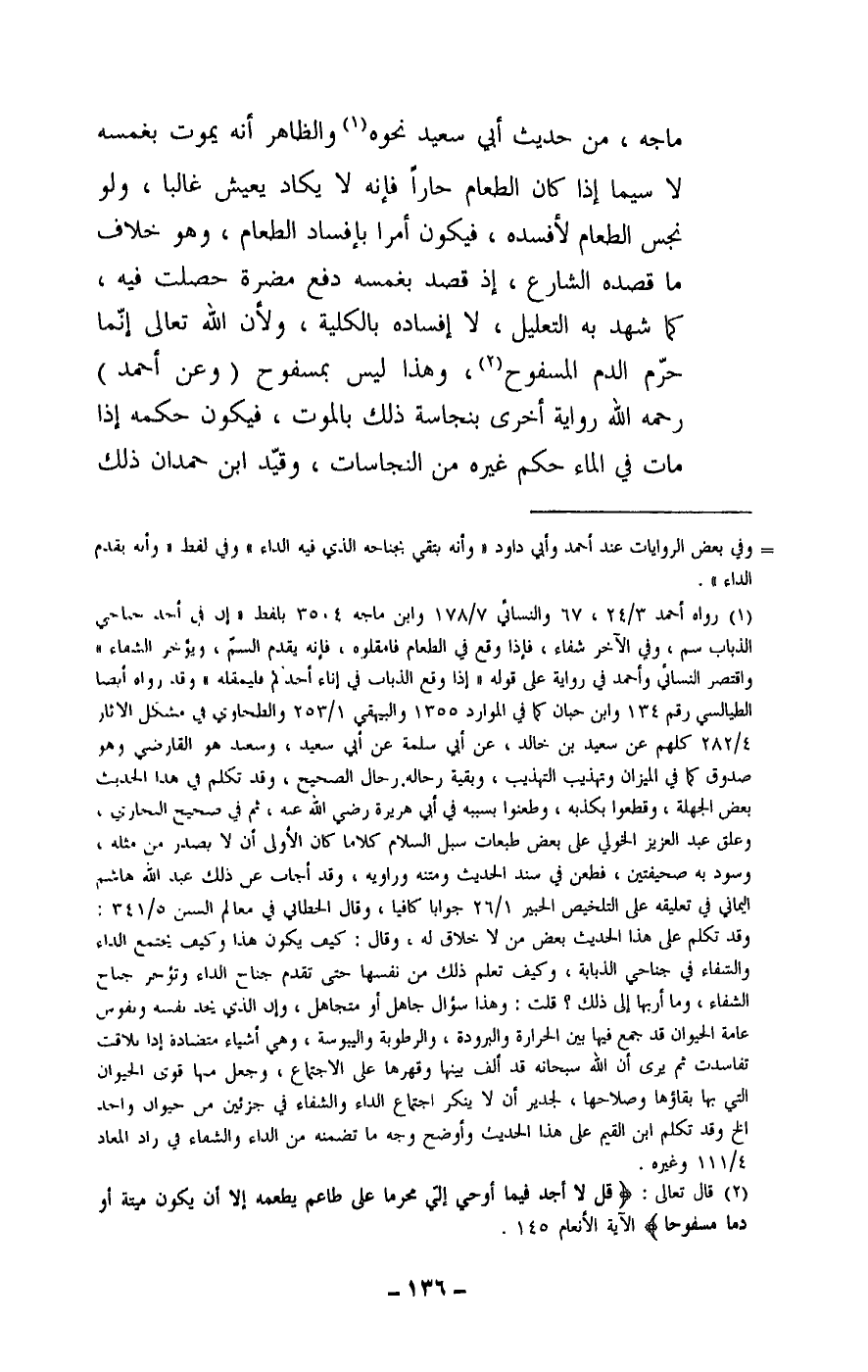 ماجه، من حديث أبي سعيد نحوه والظاهر أنه يموت بغمسه لا سيما إذا كان الطعام حارا فإنه لا يكاد يعيش غالبا، ولو نجس الطعام لأفسده، فيكون أمرا بإفساد الطعام، وهو خلاف ما قصده الشارع، إذ قصد بغمسه دفع مضرة حصلت فيه، كما شهد به التعليل، لا إفساده بالكلية، ولأن الله تعالى إنما حرم الدم المسفوح، وهذا ليس بمسفوح (وعن أحمد) - رَحِمَهُ اللَّهُ - رواية أخرى بنجاسة ذلك بالموت، فيكون حكمه إذا مات في الماء حكم غيره من النجاسات، وقيد ابن حمدان ذلك