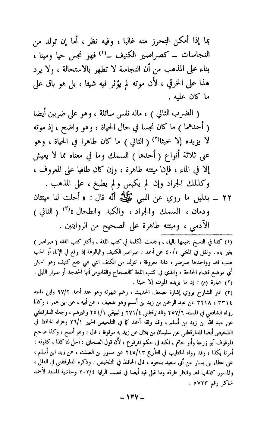 22 - بدليل ما روي عن النبي - صَلَّى اللَّهُ عَلَيْهِ وَسَلَّمَ - أنه قال: «أحلت لنا ميتتان ودمان، السمك والجراد، والكبد والطحال» .